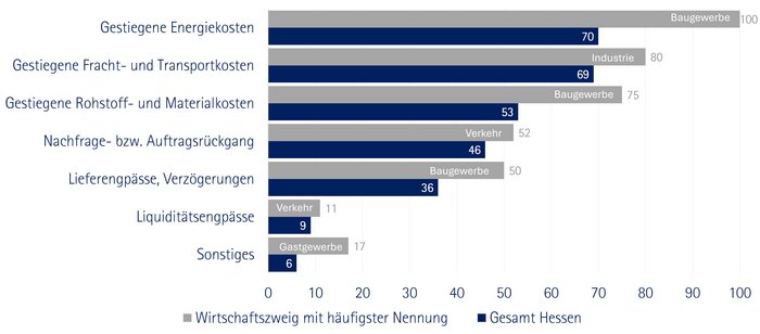 Aus Sicht der Betriebe äußern sich die Belastungen derzeit vor allem in gestiegenen Kosten, die die laufende Geschäftstätigkeit zusätzlich unter Druck setzen. Als wichtigste Belastungsfaktoren nennen die Unternehmen insbesondere steigende Energiepreise sowie erhöhte Fracht- und Transportkosten. In Hessen berichten 70 Prozent der Unternehmen von negativen Auswirkungen durch höhere Energiepreise, 69 Prozent sehen ihr Geschäft durch gestiegene Transport- und Logistikkosten beeinträchtigt.